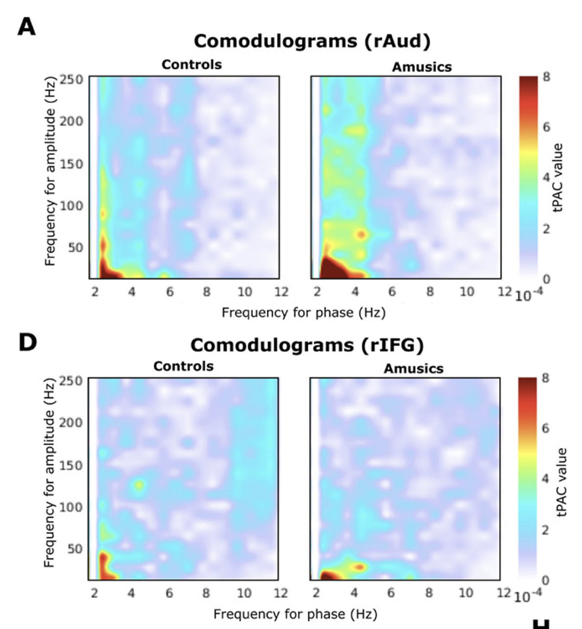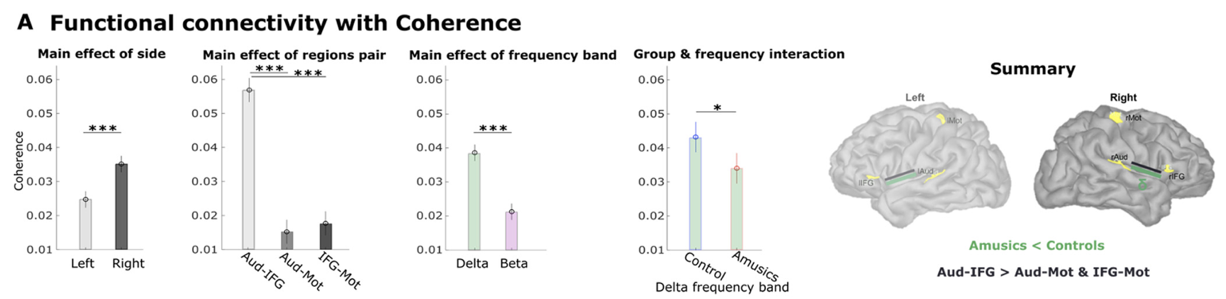 We also found that the coupling of low frequency activity was stronger in controls than in amusic participants, and very strong between the right auditory cortex and downstream, the right inferior frontal cortex.