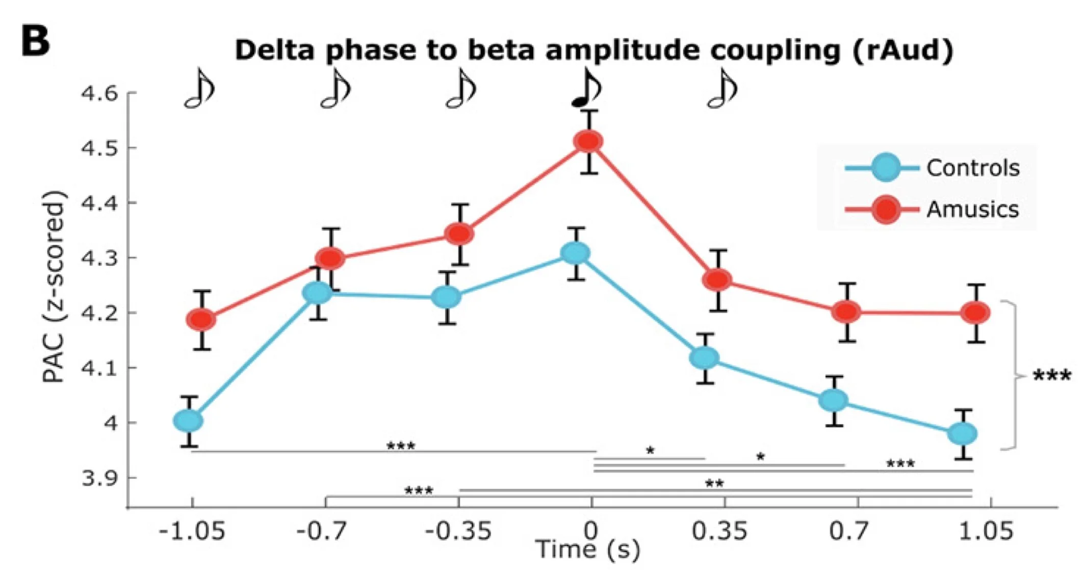The graph above shows how cross-frequency phase-amplitude coupling varies moment to moment over the presentation of the sound sequence (see black and white notes on top). The blue line shows that PAC increases as we get closer and closer to the presentation of the target note (4th in the sequence), peaks at the moment of its presentation, and then decreases back to baseline levels. Overall, the same profile is observed in amusic participants (red line), but the levels are systematically above those observed in controls (blue line).
