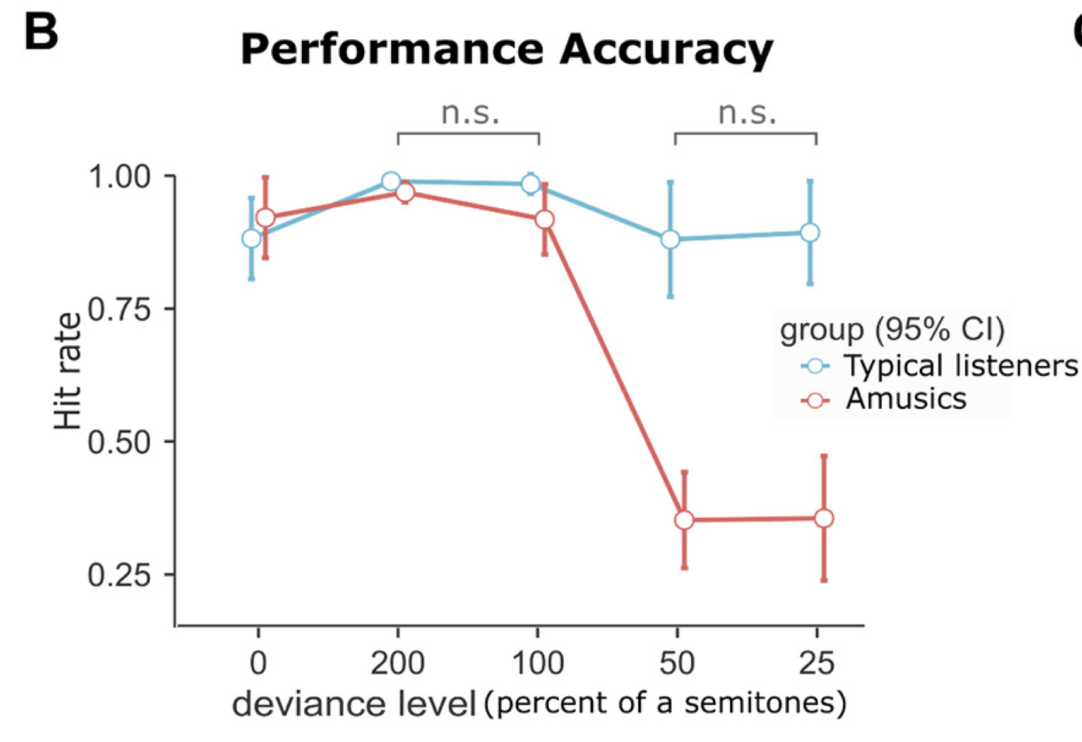 We tested two categories of participants: typical listeners with normal hearing, and amusic participants, who, despite normal hearing sensitivity, experience great difficulties perceiving melodies. Access to amusic participants, a rare syndrome, was facilitated thanks to Prof Isabelle Peretz. As expected, the amusic participants were challenged by the detection of the deviant tone, as shown in the following figure: