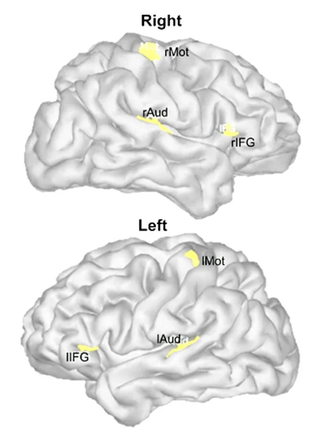 We then proceeded to map the participants’ brain activity using imaging techniques we have developed over the years. We focussed our analyses on three regions of interest in each brain hemisphere. We chose these regions because of their known involvement in auditory processes (primary auditory cortex, inferior frontal cortex), and motor areas.