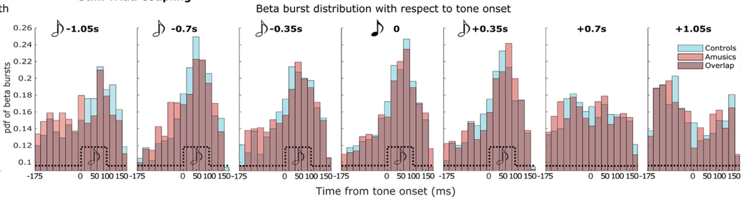 We therefore decided to look into this effect more closely, as we thought that this increased coupling may explain, at least in part, the difficulties experienced by amusic participants in detecting the acoustic changes in the sound stream.