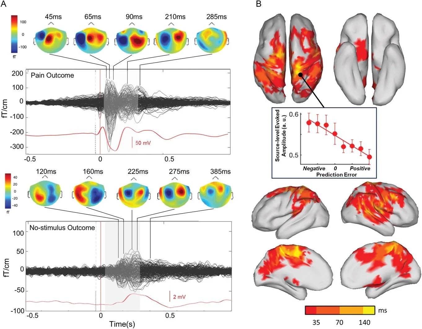 We found a specific brain circuit involved in predicting pain and registering surprise when outcomes aren’t what participants expected. This temporo-frontal circuit connects deep emotional and sensory regions to higher-level decision areas. Participants learned to choose an option less likely to yield a painful pressure on the thumb. As their expectations rose or fell, so did rhythmic activity in this brain network. In fact, moments before an outcome, certain regions in the frontal lobe (notably the lateral orbitofrontal cortex) and in the deep brain (midbrain/diencephalon areas) showed changes in an alpha active (~10 Hz) that reflected how much pain the person expected.